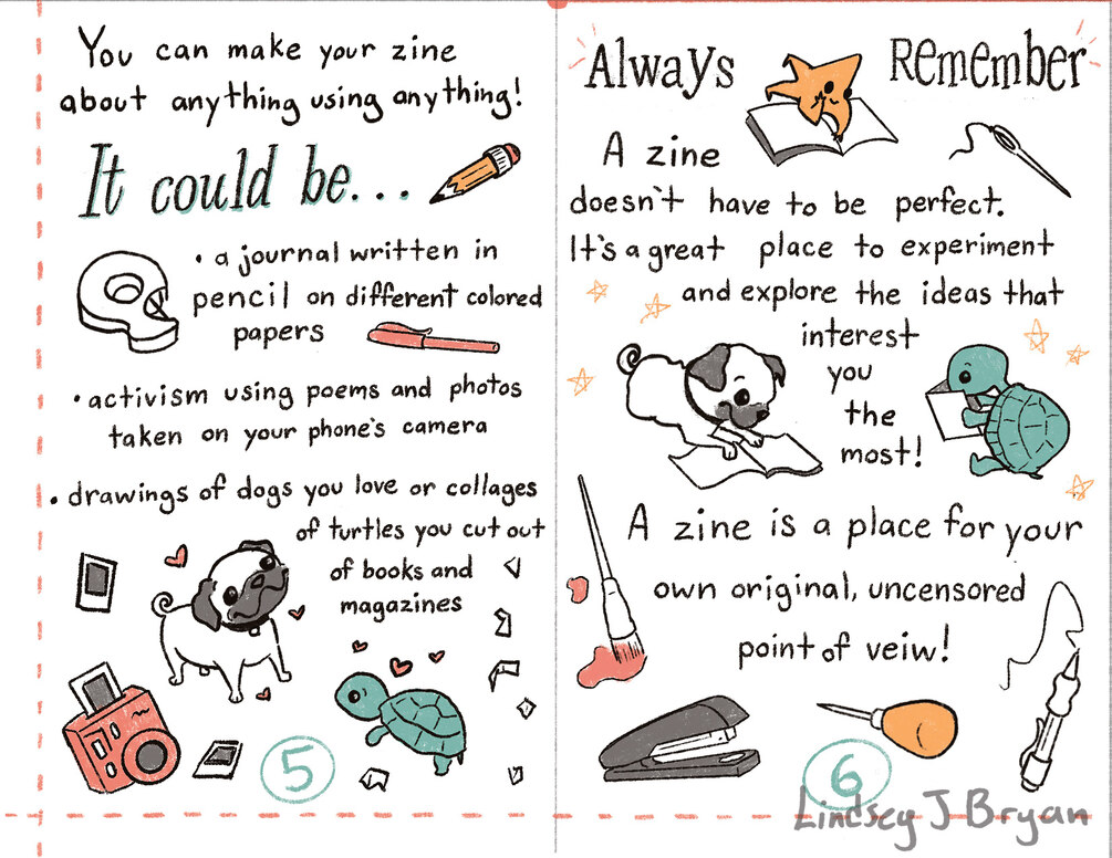 This single page instructional mini zine described the basics of zine making while becoming one! Print this pdf out and put it together to get an even better understanding of how to make your own single page mini-zine.